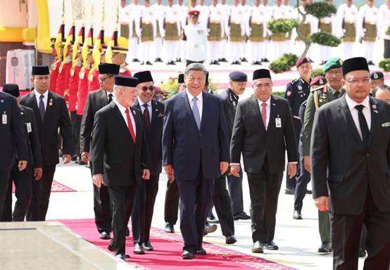 习近平乘车抵达时,易卜拉欣和马来西亚总理安瓦尔在下车处热情迎接。两国元首登上检阅台,军乐团奏中马两国国歌,鸣礼炮21响。习近平检阅仪仗队。两国元首进入国家王宫大厅,同双方陪同人员握手致意。