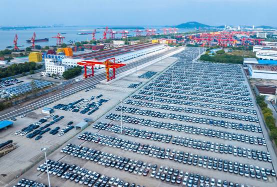 2024年11月24日,在安徽省芜湖港朱家桥港区国际集装箱码头,整齐排列的汽车等待装船出口海外(无人机照片)。新华社发(肖本祥 摄)