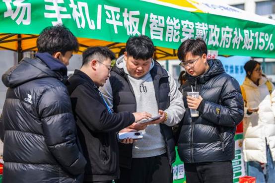 2025年3月6日,学生在山东省青岛恒星科技学院开展的消费品以旧换新活动中选购手机。(张鹰 摄)